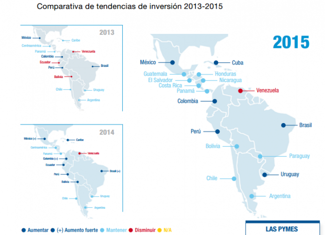 Según este estudio, el único país en donde disminuirá la inversión española en América Latina será en Venezuela. Pero esta no será la realidad de América Latina en donde el 74% de las empresas españolas consultadas tiene previsto aumentar sus inversiones en 2015, 22% las mantendrá y solo un 6% aspira disminuirlas.