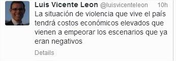 “La situación de violencia que vive el país tendrá costos económicos elevados que vienen a empeorar los escenarios que ya eran negativos", aseguró Luis Vicente León a través de su cuenta de Twitter. A su juicio, la convulsión vino para quedarse y la crisis económica, los estudiantes activos, los colectivos armados y la represión por parte del Estado representan un cóctel molotov para Venezuela.