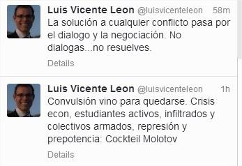Para Luis Vicente León, la convulsión había llegado para quedarse. Explica que mientras la gente se mantenga en la calle aumentarán los conflictos. “Desde un principio se planteó una protesta pacífica que exigía derechos puntuales; sin embargo, cuando se salió de control, sea por la razón que sea, todos los sectores se alteraron. Por un lado, el gobierno cree que lo quieren tumbar, por otro los estudiantes reclaman la muerte de sus dos compañeros y nunca falta aquellos que tomen ventaja de la situación para desestabilizar. Todo esto lo que hace es que la protesta se agudice y que cada vez nos alejemos más del diálogo que es la única herramienta que tenemos para solventar esta crisis”, explica.