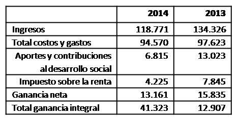 Por su parte, la ganancia neta de la empresa retrocedió 2.674 millones de dólares a 13.161 millones de dólares (MMUS$). Mientras tanto, la venta de divisas al Banco Central de Venezuela bajó desde 42.990 MMUS$ en 2013 a 39.716 MMUS$ en 2014.