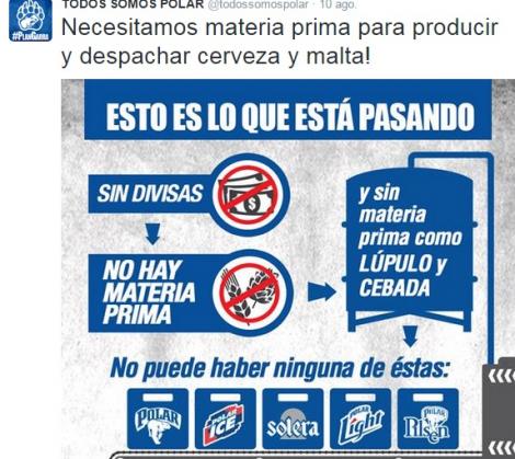El personal de “Empresas Polar” recurre a diario a su red social twitter para informar las nuevas acciones presentes en el respaldo a las distintas plantas paralizadas de esa corporación por falta de materia prima para producir, así como para difundir constantemente los problemas que les aquejan por la restricción y fiscalización impuesta por el Gobierno, luego de la expropiación al centro de Distribución en La Yaguara, que surte a la gran Caracas, Miranda y Vargas.