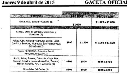 Para Canadá, Chile, El Salvador, Guatemala, Honduras, países integrantes del Alba (Antigua y Barbuda, Bolivia, Cuba, Dominica, Ecuador, Nicaragua, San Vicente y Las Granadinas) y naciones del Mercosur (Argentina, Paraguay, Brasil y Uruguay) el cupo para viajes se redujo a $700 cuando la permanencia sea de 1 a 3 días de estadía, $1000 de 4 a 7 días y de $1063 a $1500 de 8 días en adelante.