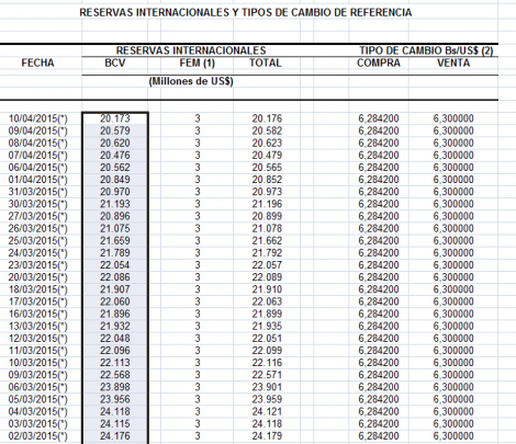 Según datos del Banco Central al 10 de abril, las reservas internacionales se colocaron en 20.173 millones de dólares, el nivel histórico registrado desde el 14 de noviembre del 2014 cuando se colocaron en 19.438.