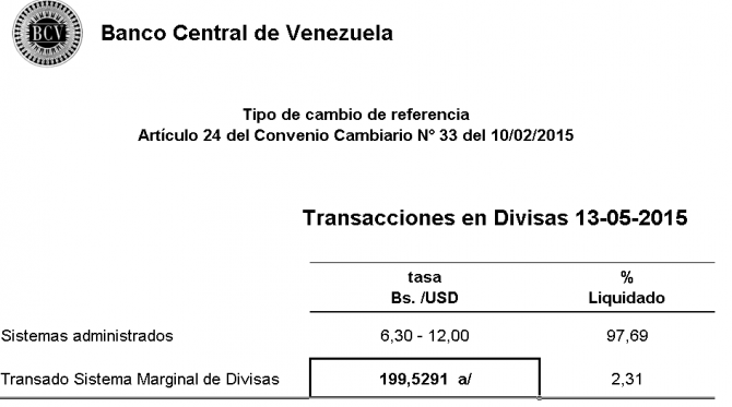 La tasa Simadi representó el 2,31 por ciento de lo liquidado, mientras que Cencoex a 6,30-12 bolívares el 97,69 por ciento.