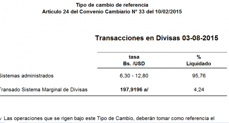 El Banco Central de Venezuela igualmente publicó en su portal que el porcentaje transado hoy por este esquema cambiario representa el 4,24% de las divisas, mientras que el otro 95,76% sigue liquidándose en los otros dos mercados, el de Bs 6,30 y el de Bs 12,80.