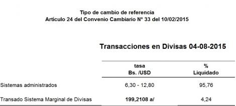 El Banco Central de Venezuela igualmente publicó en su portal que el porcentaje transado hoy por este esquema cambiario representa el 4,24% de las divisas, mientras que el otro 95,76% sigue liquidándose en los otros dos mercados, el de Bs 6,30 y el de Bs 12,80.