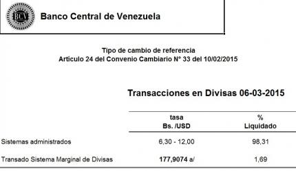 El dólar del Sistema Marginal de Divisas (Simadi) cerró el viernes en 177,9074 bolívares por dólar, publicó el Banco Central de Venezuela. El tipo de cambio fluctúa de acuerdo a la oferta y demanda, según el convenio cambiario. Mientras que el dólar paralelo cerró en 272,45 bolívares por dólar, casi 44 veces por encima del tipo de cambio de 6,30 bolívares por dólar. Sin embargo, el jueves 5 de marzo el paralelo cerró en 281 bolívares, 8.55 bolívares por debajo.