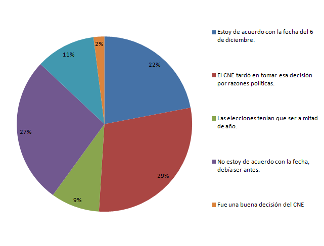 Un 22 por ciento manifestó estar de acuerdo con la fecha de las parlamentarias; un 11 por ciento espera que se cumpla la fecha; otro 9 por ciento que las elecciones debían ser a mitad de año y un 2 por ciento opina que fue una buena decisión del CNE.