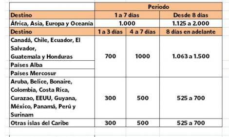 Para Aruba, Belice, Bonaire, Colombia, Costa Rica, Curacao, Guayana, México y Panamá, Perú y Surinam, se mantienen la asignación de 300 dólares (De 1 a 3 días de estadía) y 500 dólares (De 4 a 7 días), mientras que se redujo el cupo de 700 a 525 dólares (De 8 días en adelante).
