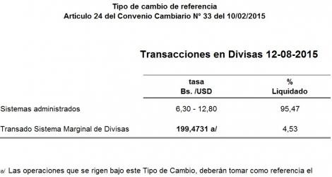 El Banco Central de Venezuela igualmente publicó en su portal que el porcentaje transado hoy por este nuevo esquema cambiario representa el 4,53% de las divisas, mientras que el otro 95,47% sigue liquidándose en los otros dos mercados, el de Bs 6,30 y el de Bs 12,80.