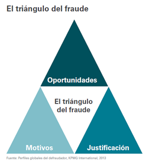 los especialistas de la Práctica Forense de KPMG en China, “las personas cometen fraude cuando las tres condiciones se dan simultáneamente, como una tormenta perfecta: la motivación, la oportunidad y la habilidad para justificar el crimen. Esto explica las razones por las cuales ocurre el fraude y el porqué un tipo particular de personas se convierte en defraudadores”. Los tres inductores son parte de una metodología estándar que desarrollaron los especialistas en fraude en los años 50. Se puede incluir la habilidad como un componente de oportunidad para crear una imagen mucho más completa de la persona que comete fraude. Esta es una manera de entender dicha imagen: el posible defraudador ve una puerta abierta mediante la oportunidad; la motivación y la justificación lo impulsan hacia la puerta, y su habilidad le permite cruzarla.
