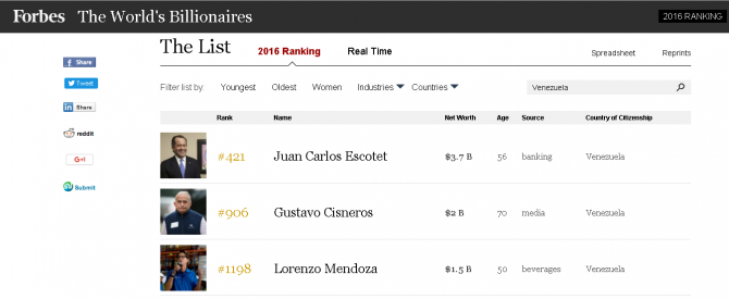 El presidente de Empresas Polar, Lorenzo Mendoza, quedó de tercero con una fortuna calculada en 1.500 millones de dólares.