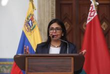 La cancillería emitió un comunicado en el que calificó como una "medida grotesca" la acusación contra el vicepresidente Tareck El Aissami, "un venezolano decente y digno". La posición de Venezuela fue leída por la canciller Delcy Rodríguez.