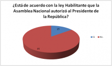 Del total de participantes el 85% respondió estar en contra y no apoyar a que Maduro tenga poderes especiales para legislar. Mientras que el 15% considera que sí se justifica esta segunda Ley Habilitante.