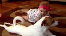 Un hermoso perro enseña a gatear a una niña de una manera muy tierna, dando el ejemplo y repitiendo los movimientos para guiarla.