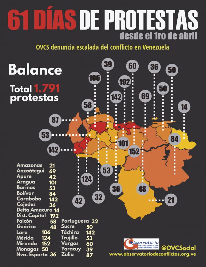 El Observatorio Venezolano de Conflictividad Social (OVCS) registró 1.791 manifestaciones en todo el país desde el 1 de abril hasta el 31 de mayo de 2017, equivalente a 30 protestas diarias.