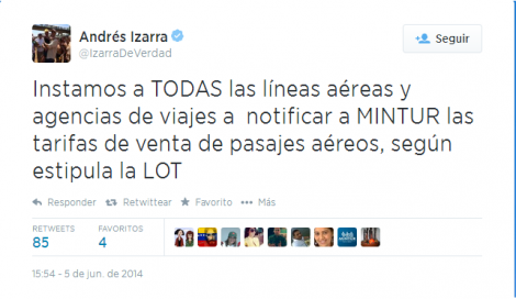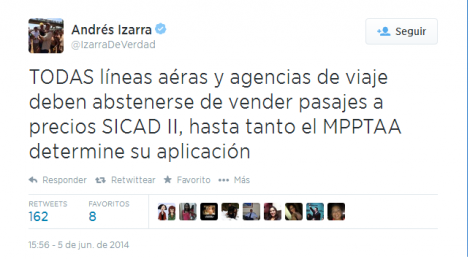 Aerolíneas deberán abstenerse de vender sus boletos a tasa del Sistema Cambiario Alternativo (Sicad I)I hasta tanto el Ministerio de Turismo de la orden. Así lo afirmó el jefe de dicha cartera, Andrés Izarra, el día jueves, vía su cuenta personas en la red social Twitter.