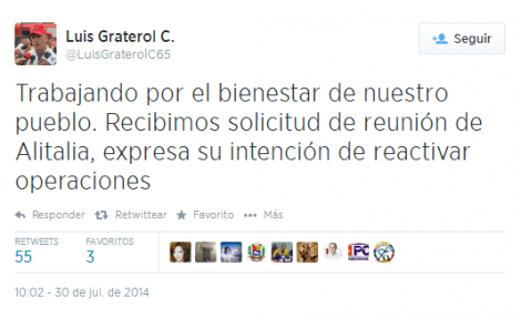 La aerolínea italiana Alitalia habría manifestado su voluntad de reincorporarse al cielo venezolano. Así lo dio a conocer este miércoles el nuevo ministro de Transporte Acuático y Aéreo, Luís Graterol, a través de su cuenta en la red social Twitter.