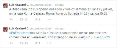 A partir de ahora, la empresa realizará dos viajes semanales los días lunes y viernes. La ruta será Roma – Caracas – Roma. Graterol aseguró que Alitalia aumentará la frecuencia de sus vuelos.