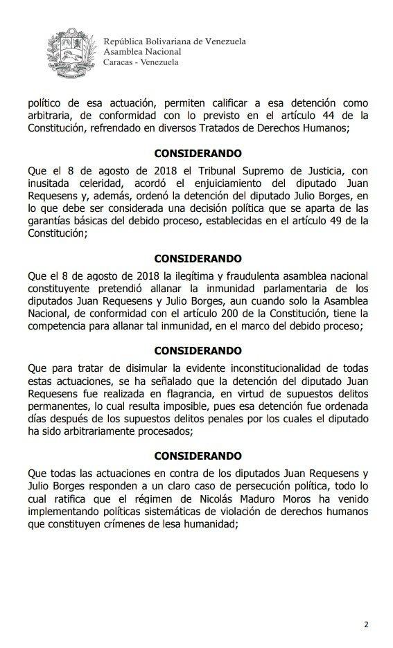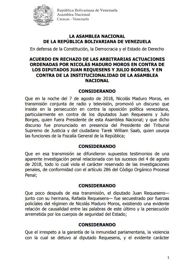 El documento lleva por nombre Acuerdo en Rechazo a las Arbitrarias Actuaciones Ordenadas por Nicolás Maduro Moros en contra de los diputados Juan Requsens y Julio Borges, y en contra de la institucionalidad de la Asamblea Nacional.