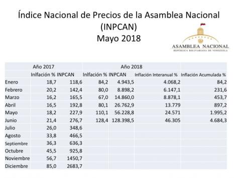 El Índice Nacional de Precios al consumidor cerró el primer semestre del año en 4.684,3 por ciento, debido al crecimiento excesivo de los precios, informó la Asamblea Nacional.