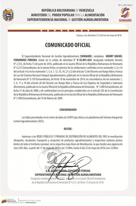 "Esta autorización incluye el despacho, circulación, transporte y recepción de productos por un periodo de cinco días a partir del día 17 de mayo, hasta el 22 de mayo de 2018 a las 12:00 p.m", dijo el organismo a través de un comunicado, en el que citan al Superintendente Nacional de Gestión Agroalimentaria, Menry Rafael Fernández Pereira.