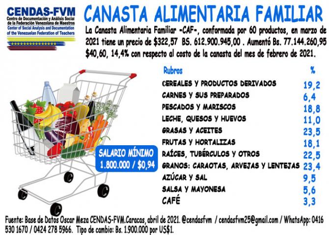 El costo de la canasta alimentaria subió 14,4% en marzo a 613 millones de bolívares, según un reporte del Centro de Documentación y Análisis Social (Cendas) de la Federación Venezolana de Maestros.