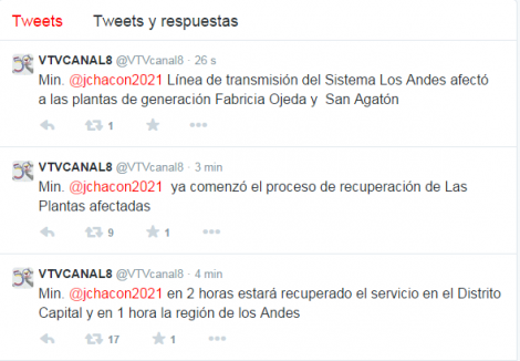 Estas declaraciones las ofreció a las 2:50 de la tarde. Por otro lado, el ministro agregó que ya se comenzó el proceso de recuperación de las plantas afectadas y que la línea de transmisión del Sistema Los Andes afectó a las plantas de generación Fabricia Ojeda y San Agatón.
