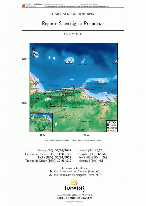 La Fundación Venezolana de Investigaciones Sismológicas (Funvisis) señaló que desde que se registró el sismo de 4,5 de magnitud, se han registrado cuatro réplicas de menor intensidad.