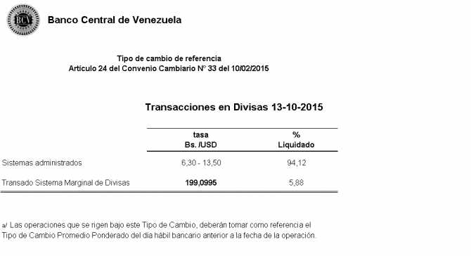 Esa tasa representó el 5,88 de lo liquidado, mientras que los sistemas administrados de Cencoex y Sicad (6,30-13,50) significaron el 94,12 por ciento, agregó el emisor.