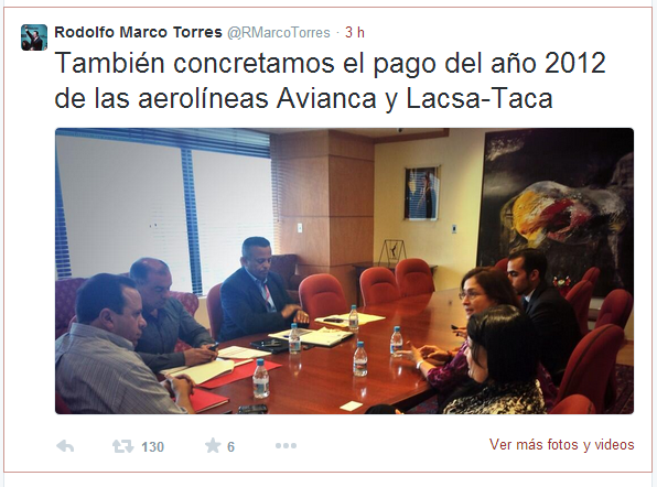 Uno de los avances que Torres destacó fue el pago de la deuda con seis aerolíneas internacionales. “Concretado el pago total 2013 de las aerolíneas AeroMéxico, Insel Air, Tame Ecuador y Tiara Airlines”, expresó el titular de la cartera económica.