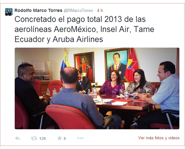 Por otro lado, desde horas de la mañana, el Ministro del Poder Popular de Economía, Finanzas y Banca Pública, Marcos Torres, informó a través de su cuenta Twitter que el gobierno inició reuniones con los representantes de diversas aerolíneas para coordinar el pago de la deuda que el sector público mantiene con las aerolíneas. Dentro de las empresas que se reunieron hoy con el gobierno se encuentran AeroMéxico, Insel Air, Tame Ecuador, Aruba Airlines, Lacsa-Taca y Avianca.