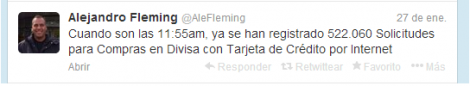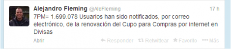 Así mismo, Fleming apuntó a través de la red social que, para la mañana de ayer lunes, ya habían tenido lugar más de 500.000 solicitudes para compras en divisas con el “cupo electrónico”.