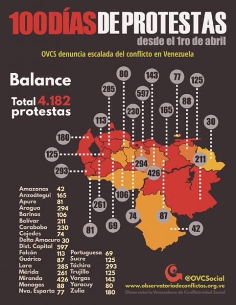 El Observatorio Venezolano de Conflictividad Social (OVCS) registra 4.182 manifestaciones desde el 1 de abril hasta el 9 de julio de 2017 en 100 días de protestas, equivalente a 42 protestas diarias, que han dejado al menos 92 personas muertas, según un informe publicado el lunes.