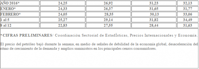Este indicador es inferior en 3,44 dólares respecto a la semana del 1 al 5 de febrero, cuando se ubicó en 25,27 dólares el barril.