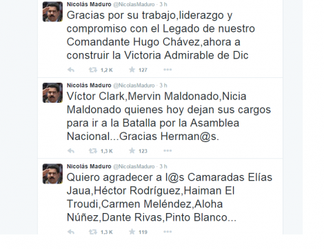 Agradeció a Elías Jaua, Héctor Rodríguez, Haiman El Troudi, Carmen Meléndez, Aloha Núñez, Dante Rivas, Gilberto Pinto Blanco, Víctor Clark, Mervin Maldonado y Nicia Maldonado "quienes hoy dejan sus cargos para ir a la Batalla por la Asamblea Nacional".