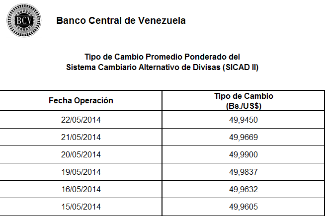 La tasa de cambio promedio de las transacciones de este jueves en el Sistema Cambiario Alternativo de Divisas (Sicad II) se ubicó este jueves en 49,94 bolívares por dólar. Frente a los Bs. 49,96 que arrojó ayer el indicador permuta, esta es la segunda baja en cinco jornadas.