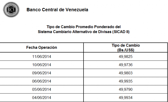 La tasa promedio de las operaciones del Sistema Cambiario Alternativo de Divisas (Sicad II) se ubicó este miércoles en 49,98 bolívares por dólar estadounidense. La cifra denota un incremento frente a lo Bs. 49,97 promediados durante la jornada previa.