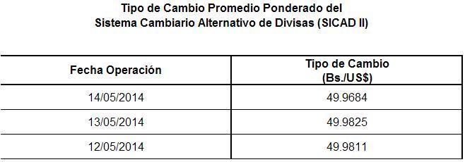 El tipo de cambio promedio ponderado del Sistema Cambiario Alternativo de Divisas (Sicad 2) cerró este miércoles en 49,96 bolívares por dólar, lo que representa una reducción de 0,02 céntimos con respecto a los 49,98 que marcó durante la jornada del martes, informó el Banco Central de Venezuela (BCV).