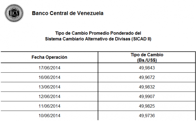 La tasa del Sistema Cambiario Alternativo de Divisas promedió este martes, 17 de junio, los 49,98 bolívares por dólar estadounidense. Ello representaría aun alza frente a los Bs. 49,96 promediados en la jornada previa.