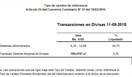 El BCV igualmente publicó que el porcentaje transado hoy por este nuevo esquema cambiario representa el 5,25% de las divisas, mientras que el otro 94,75% sigue liquidándose en los otros dos mercados, el de Bs 6,30 y el de Bs 13,50.