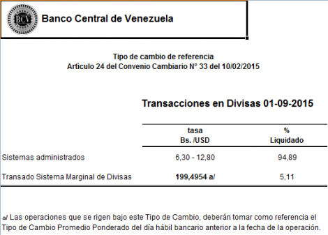 El BCV igualmente publicó que el porcentaje transado hoy por este nuevo esquema cambiario representa el 5,11% de las divisas, mientras que el otro 94,89% sigue liquidándose en los otros dos mercados, el de Bs 6,30 y el de Bs 12,80.