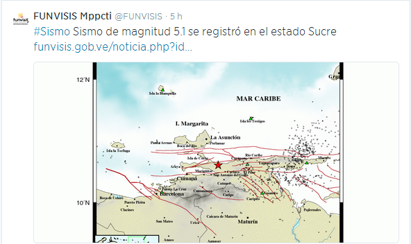 La Fundación Venezolana de Investigaciones Sismológicas (Funvisis) informó a través de su cuenta en Twitter que se registró, este lunes a las 07:04 de la mañana, un temblor de magnitud 5.1 en el estado Sucre.