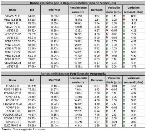 Por otro lado, la firma informó que las deudas externa venezolana y de Pdvsa cerraron con acentuada recuperación en sus precios, de 2,75 y 2,50 puntos promedio, respectivamente.