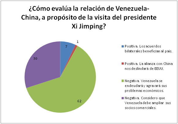 Para el 64 % de los participantes es negativa debido a que “Venezuela se endeudará y agravará sus problemas económicos”. El otro 30 % también opina que es negativa porque “Venezuela debe ampliar sus socios comerciales”.