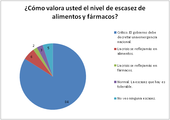 Del total de participantes el 84% considera que la escasez se encuentra en niveles críticos y que “el gobierno debe decretar una emergencia nacional”, mientras que para el 5% es mentira que se registre desabastecimiento y asegura que no siente ninguna escasez. El 3% califica esta situación como normal y que la escasez que hay es “tolerable”.