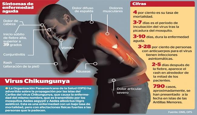 Según la Organización Mundial de la Salud (OMS), la fiebre chikungunya es una enfermedad vírica transmitida al ser humano por mosquitos infectados. Además de fiebre y fuertes dolores articulares, produce otros síntomas, tales como dolores musculares, dolores de cabeza, náuseas, cansancio y erupciones cutáneas.