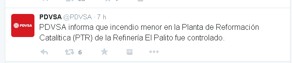 "PDVSA informa que incendio menor en la Planta de Reformación Catalítica (PTR) de la Refinería El Palito fue controlado", dijo la estatal en su cuenta de Twitter @PDVSA, sin dar mayores detalles sobre heridos o efectos en el suministro de combustible.