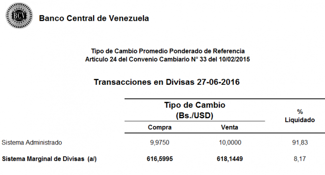 La tasa del nuevo sistema flotante de divisas subió a 616,5995 para la compra, y para la venta a 618,1449 bolívares por dólar en la jornada del lunes 27 de junio, informó el Banco Central.