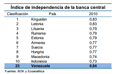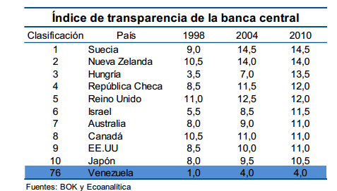 Este documento revela que el BCV se encuentra en el lugar 76 de 120 bancos centrales en relación a la transparencia, según un estudio que hizo el Banco Central de Corea (BOK). Mientras que en materia de independencia, el BCV se ubicó en el puesto 23 de 89 bancos.